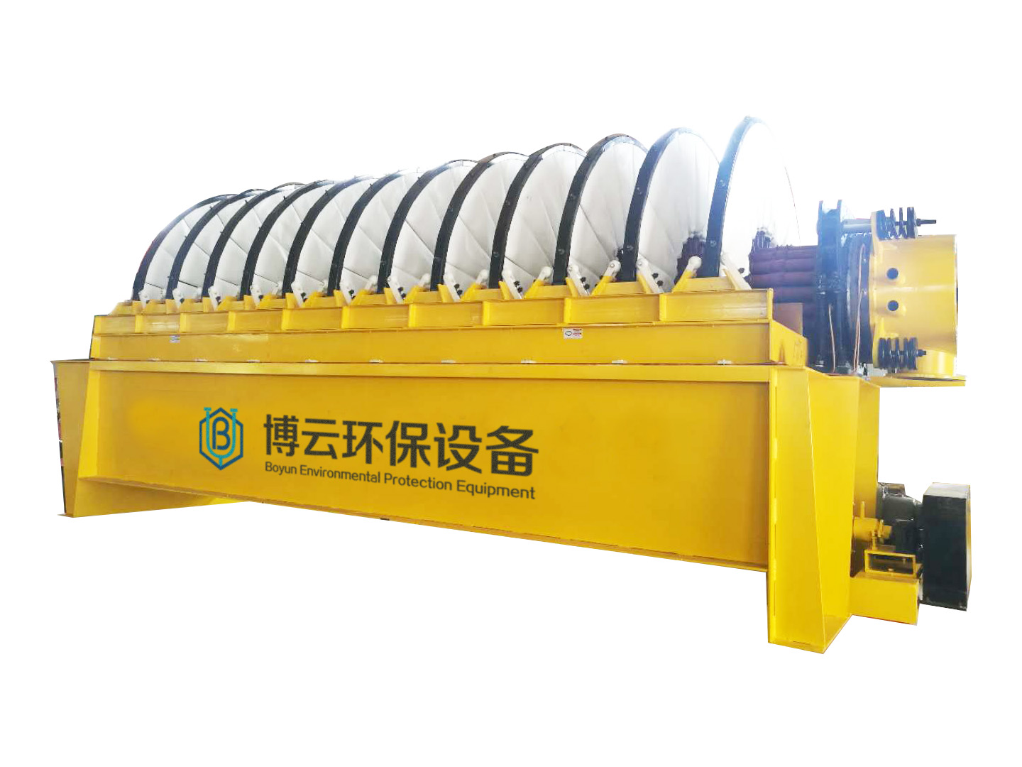 PG系列盤式真空過濾機 (1)扇形濾板脫水孔分布均勻,孔率合理,筋條尺寸大,由高強度工程塑料制成,壽命提高了2-3倍。 (2)濾液管過濾數(shù)面大,分配頭腹腔容積大,提高了抽氣率和濾液排放效果。 (3)耐磨錦綸、單或復(fù)絲濾布使脫餅率高且不易堵塞,使用壽命長。 (4)多點干油泵集中多點自動潤滑。 (5)濾布自動清洗裝置,保持了其良好的脫水效果。 (6)臥式強制高速攪拌、軸端采用橡膠及石墨盤根和水壓差三重密封不漏漿。 (7)主傳動無級變速,依物料的濃度及流量調(diào)節(jié)(交流調(diào)速電機或變頻器),以求達到理想的工作效果 。 (8)每盤由20片扇形板組成,加強了過濾過程控制,成餅厚度均勻。 (9)磨擦片采用特制耐磨硼鑄鐵,剛?cè)嵯酀芊饧眩褂脡勖_到十年以上。 (10)濾液管為高強度耐磨陶瓷復(fù)合鋼管,提高壽命10倍以上。 (11)濾液管與濾扇接口去掉下法蘭,采取模具定位直接焊接,減少了90%可能的漏氣點。
